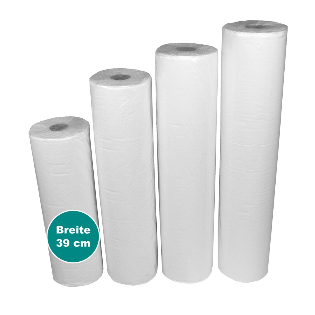 Ärzterollen/Ärztekrepp, hochweiß, 2-lagig, Zellstoff, perforiert, 39×37 cm, 135 Abrisse, 50 m, 9 Rollen (Art. 30540-1)